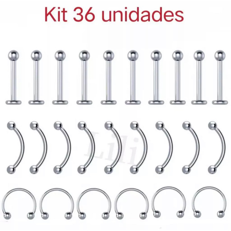 Kit 36 piercings com(3cartelas) juntos piercing furradura speto labret microbell curvo em aço cirúrgico