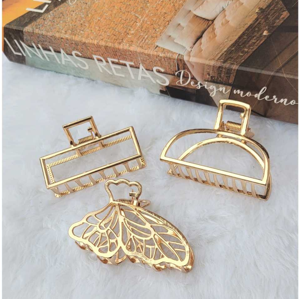 Kit 3/1 Peça Piranha de Metal Dourada Luxo Prendedor de Cabelo