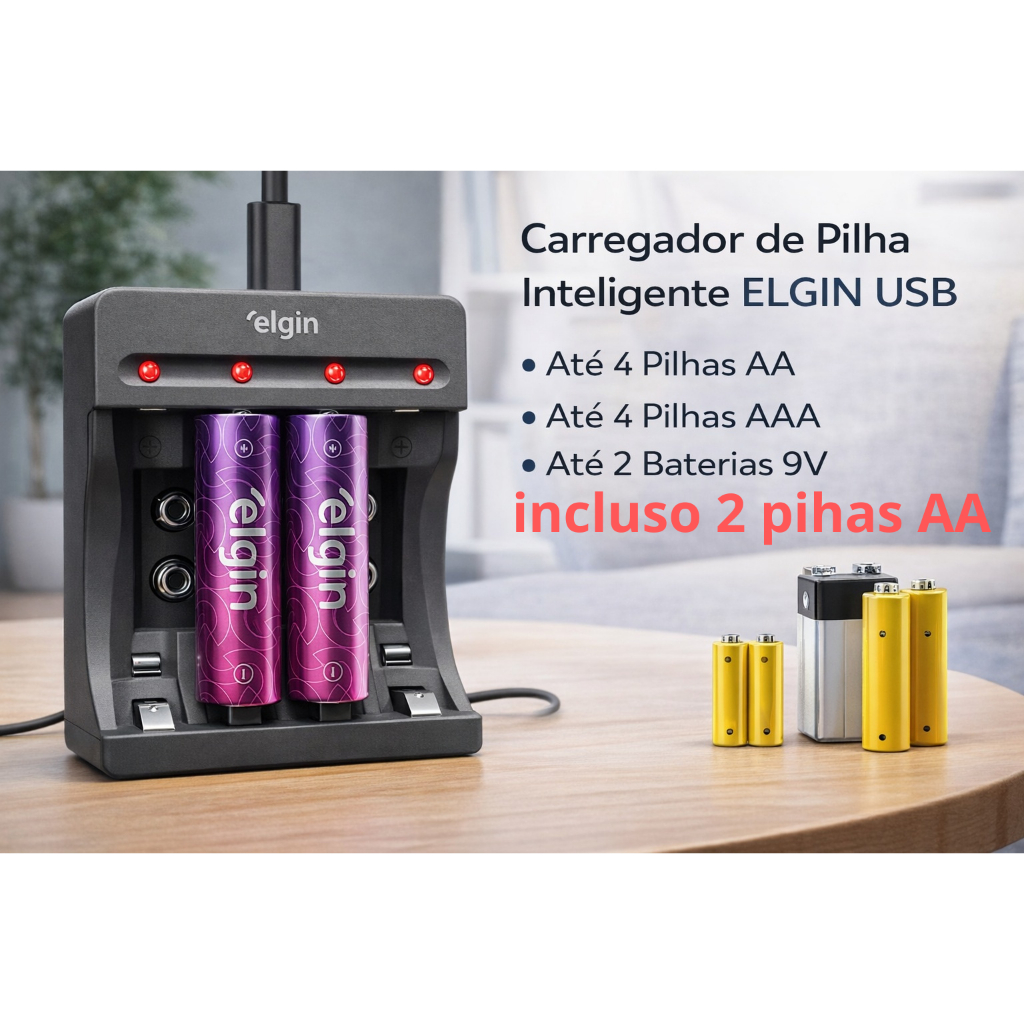 Comprar na ShopeeCarregador de Pilhas 4xAA ou 4xAAA e 2x Bateria 9v Elgin - Com 2 Pilhas Recarregáveis AA