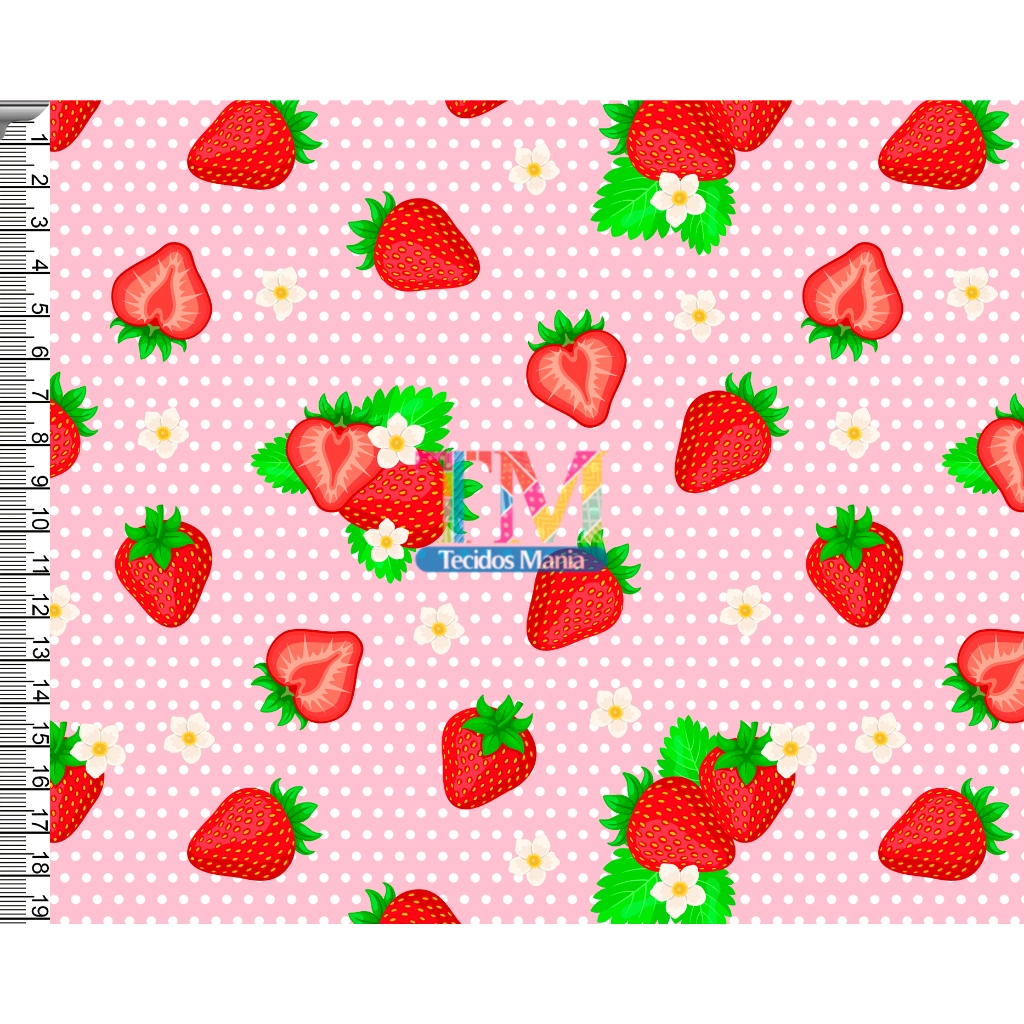 Tecido tricoline, microfibra ou gabardine estampado - Morango - Fundo Bolinhas - Rosa - 0.50cm