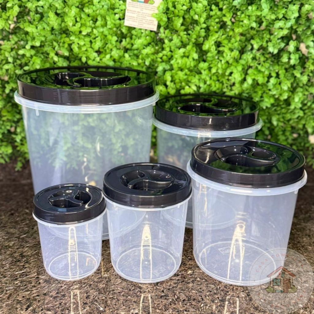 Comprar na ShopeeConj. Mantimento 5 Peças - Tampa C/ Rosca Preto - Transparente Organizador de Cozinha