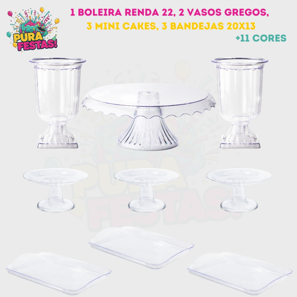 Comprar na ShopeeKit Festa - 1 Boleira Renda 22, 2 Vasos Gregos, 3 Mini Cakes, 3 Bandejas 20X13 - Diversas Cores