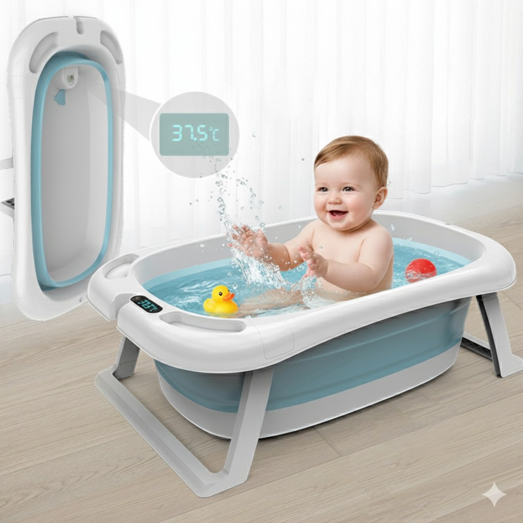 Banheira Dobrável Bebê Premium Teu Baby Com Termômetro Almofada Confortável Válvula De Drenagem