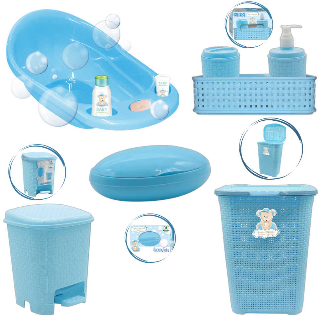 Comprar na ShopeeKit Para Banho Organizador Bebê Baby Azul Menino Saboneteira Cestos E Lixeira