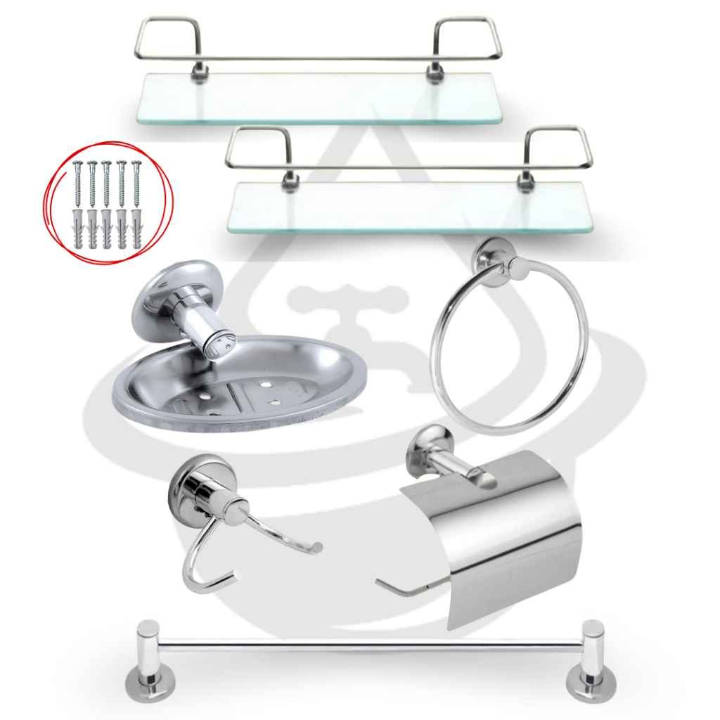 Comprar na ShopeeKit Acessórios para Banheiros 5 peças + 2 Porta Shampoo Reto Inox Vidro Temperado