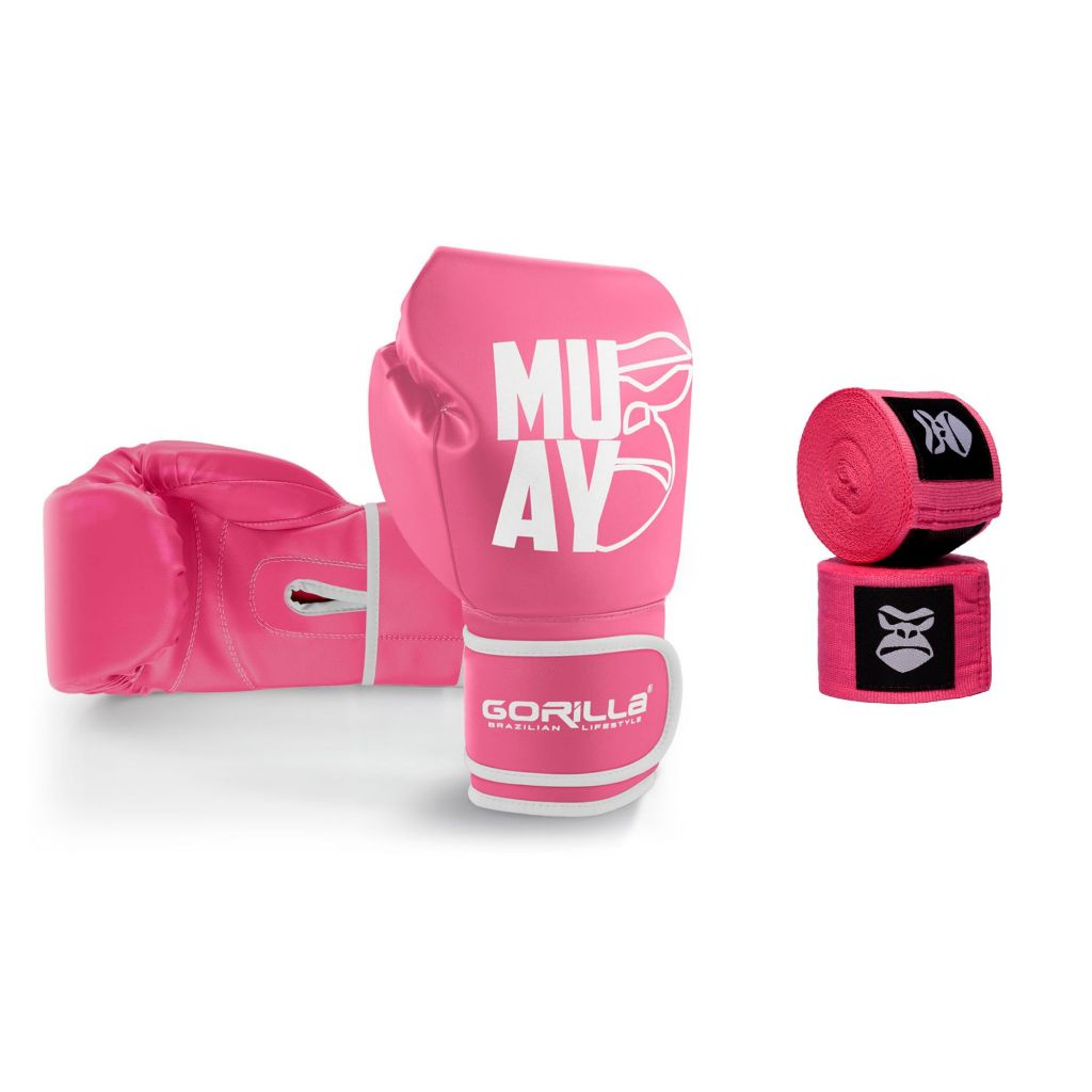 Comprar na ShopeeKit Treino Feminino Luva de Boxe 12OZ Gorilla Profissional+ Bandagem 3mt Rosa Gorilla Luta Muai Thai