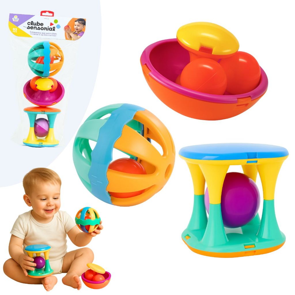 Kit Chocalho Sensorial Gira Ball Brinquedo Didático Educativo Infantil Torre Colorido Som Suave Bebê