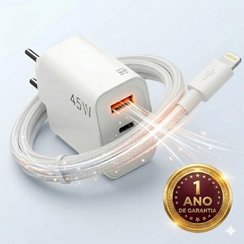 Carregador Para iPhone Turbo Super Rapido 45W USB-C Fonte Rápida c/ Cabo Lightning Duplo USB-C Apple