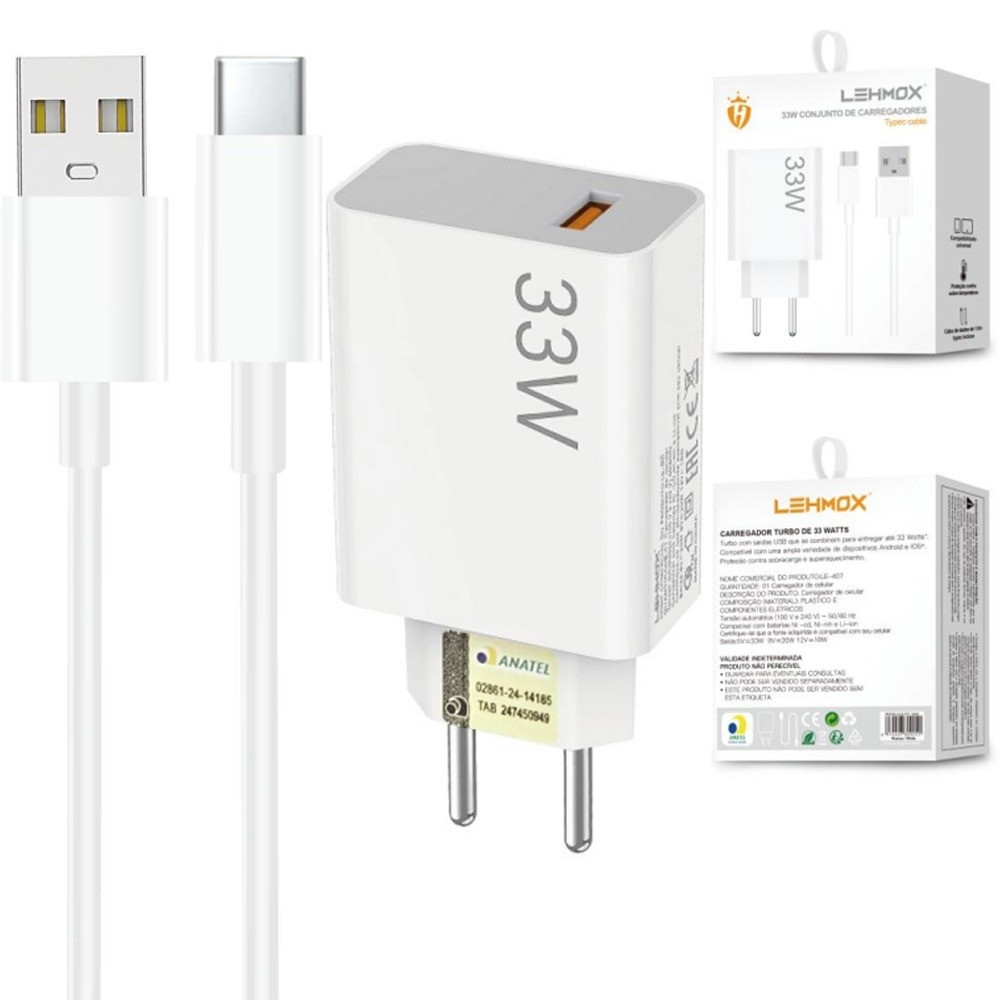 Carregador Turbo Power Lehmox 33W Compatível iPhone 7 8 11 12 13 15 Branco