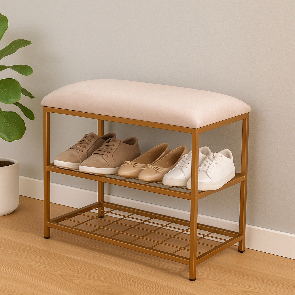 Comprar na ShopeeSapateira Banco 2 Andares Metal Dourado com Assento Estofado Veludo Liso Organizador de Sapatos Entrada Quarto Closet