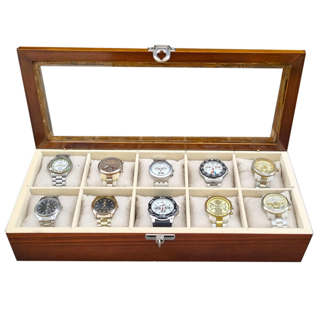 CAIXA/ESTOJO PARA 10 RELÓGIOS- IMBUIA FLOCADO DE BEGE