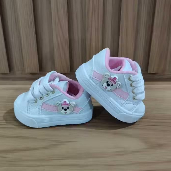 Tênis infantil de menina bebe branco com detalhe rosa enfeite ursa marinheiro estiloso casual
