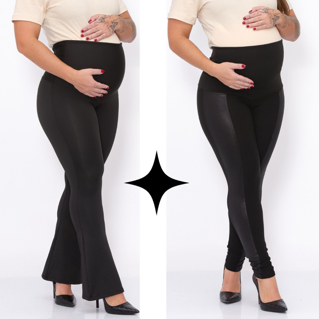 KIT 2 Peças Calças Flare Gestante + Legging Montaria Cirre Maternidade Preta Zero Transparencia