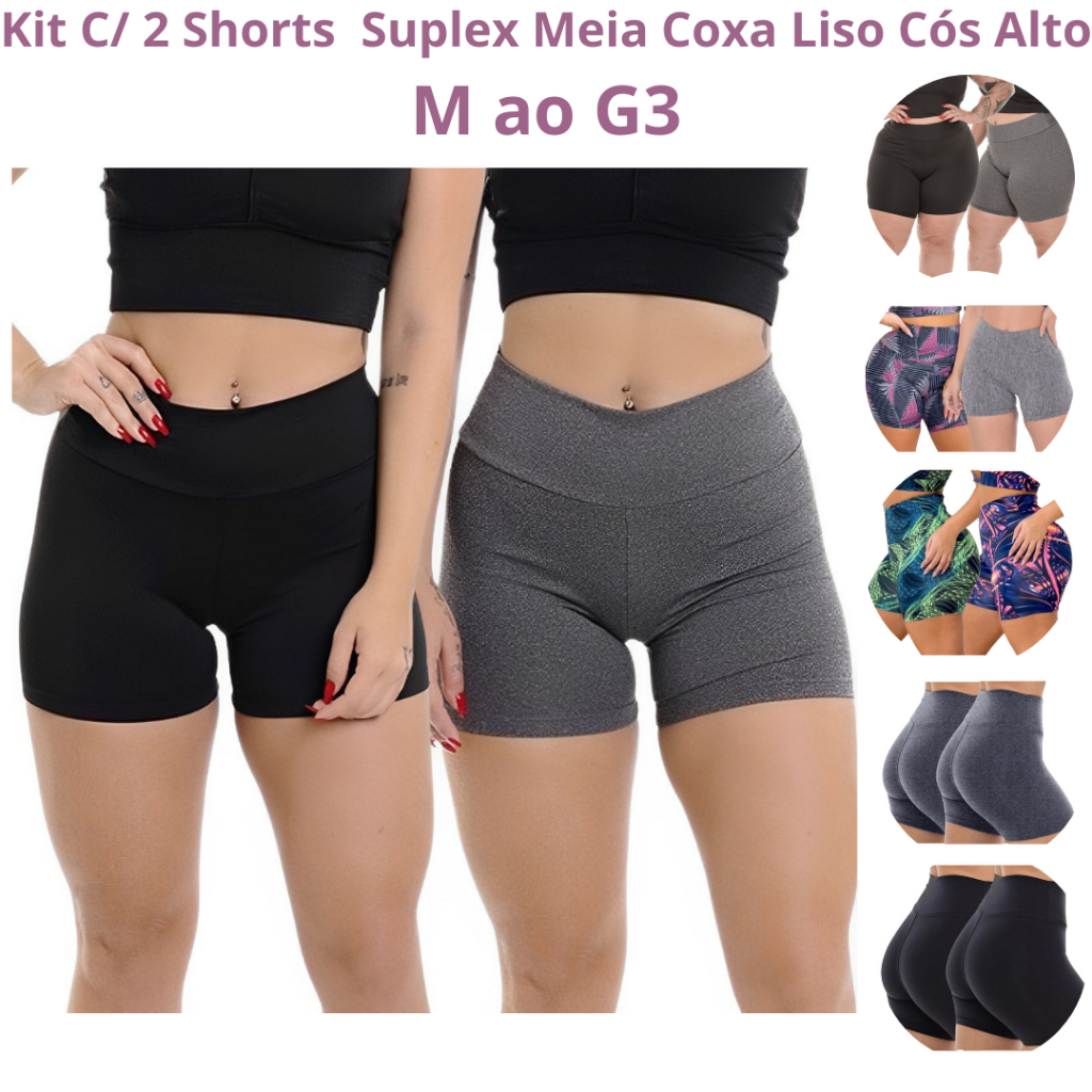 Kit C/ 2 Shorts Meia Coxa Legging Feminino Fitness Academia Em Suplex Liso Cós Alto