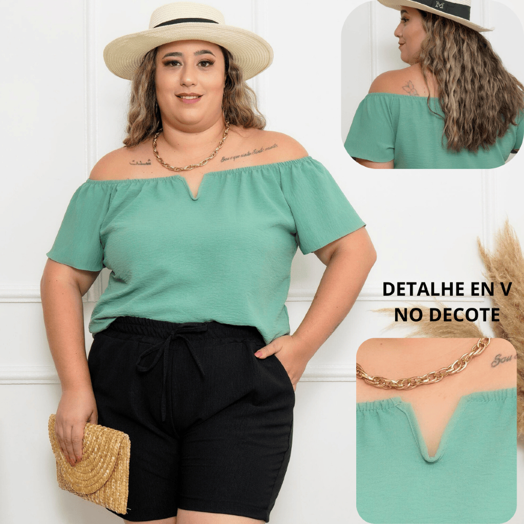 Comprar na ShopeeBLUSA CIGANA OMBRO A OMBRO DECOTE V MANGA CURTA NO DUNA PLUS SIZE