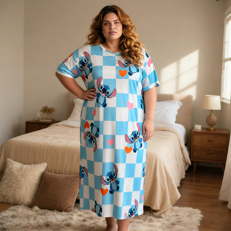 [Pijamas Grandes] (40-150kg) Vestido De Noite Feminino Verão Xadrez Estampa Ponto Fofo Solto Ajuste Loungewear Roupas