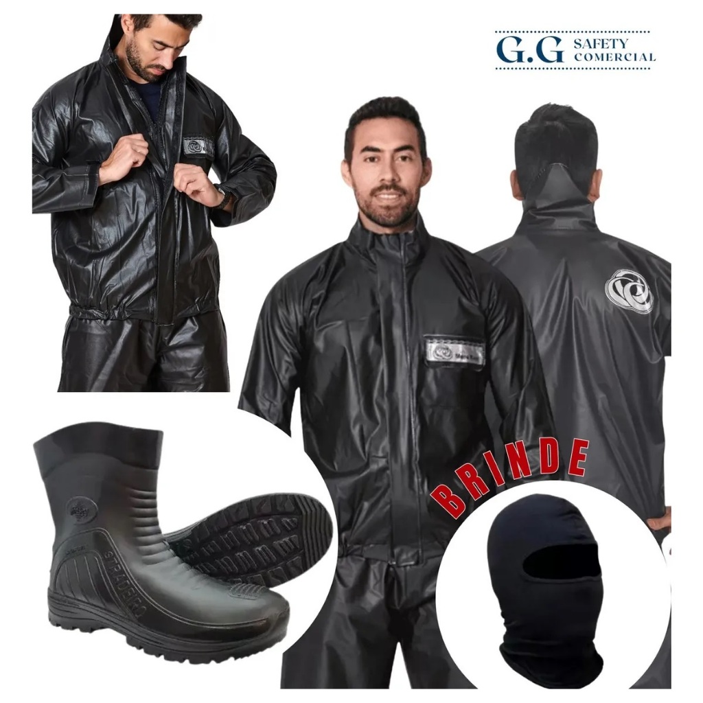 Comprar na ShopeeCapa De Chuva - Conjunto Calça Jaqueta Impermeavel Luxo Pvc Com Bolso - Moto / Motoboy / Motoqueiro + Bota Borracha + Touca Ninja + Rede Elastica