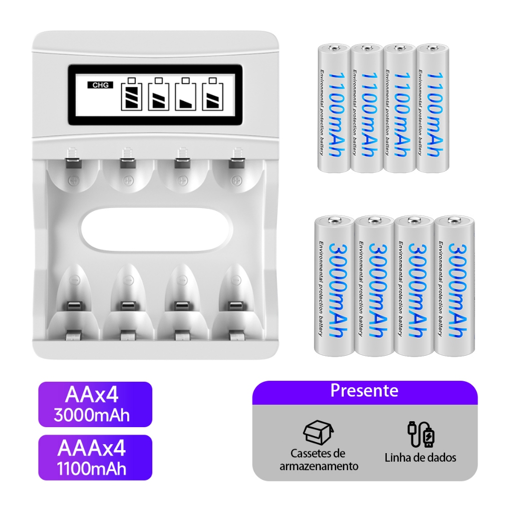 Comprar na ShopeeKit Carregador De Pilhas Recarregável AA/AAA 1.2V 3000mAh/1110mAh De 8 Bateria Recarregável 1200 vezes