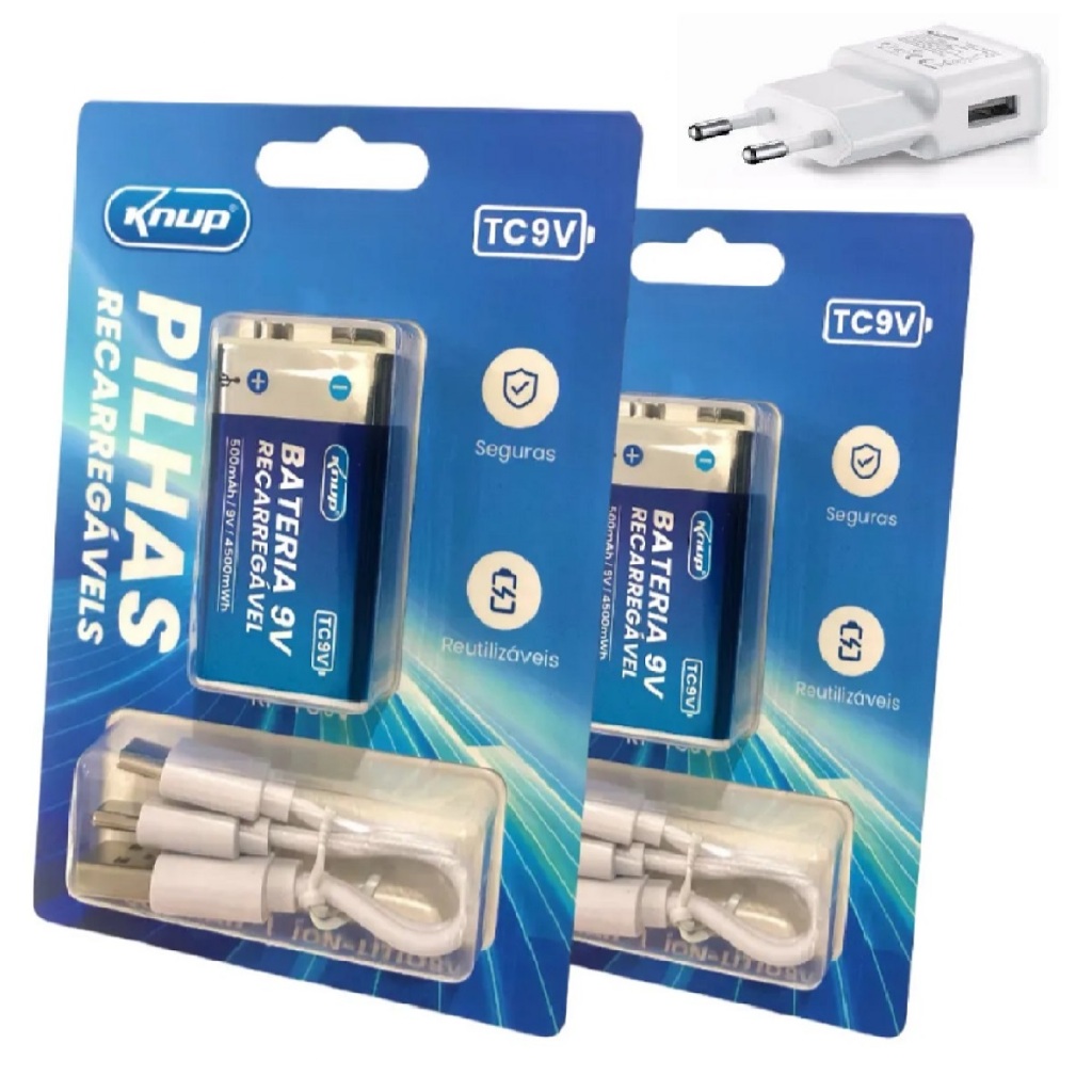 Comprar na ShopeeBaterias 9v USB 500mAh Kit com 1 ou 2 unds de Litio Knup Recarregáveis Cabo USB-C ou Fonte 5v