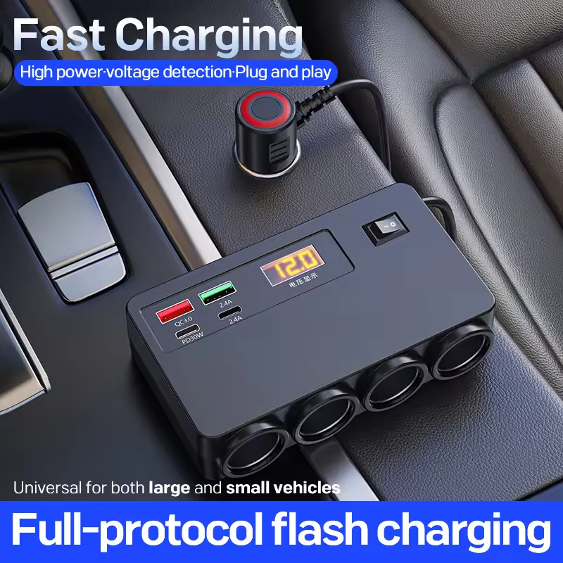 Carregador Veicular Multifuncional 120W USB/TIPO-C com 4 Interfaces de Conversão, Carregamento Rápido e Display Digital