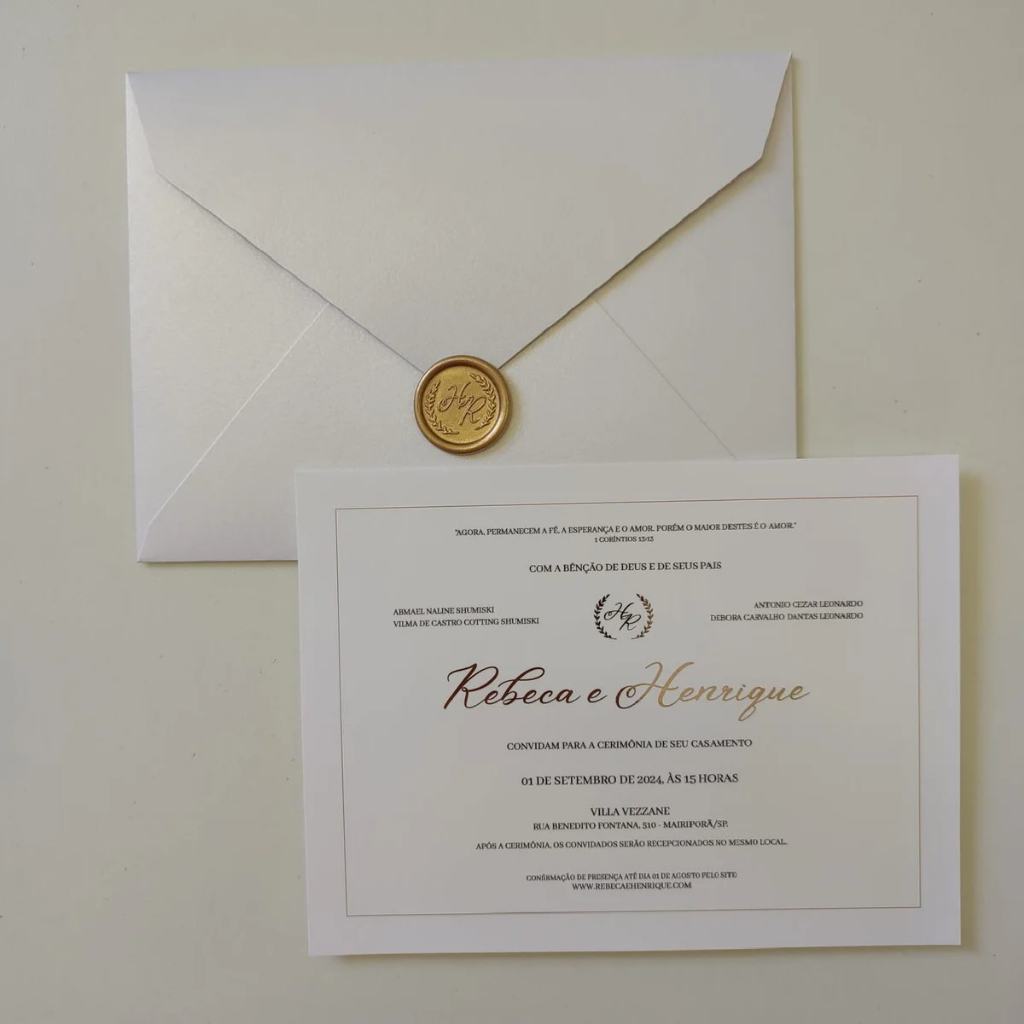 35 Convite Casamento c/ Metalizado e Lacre de Cera Dourado com borda em relevo