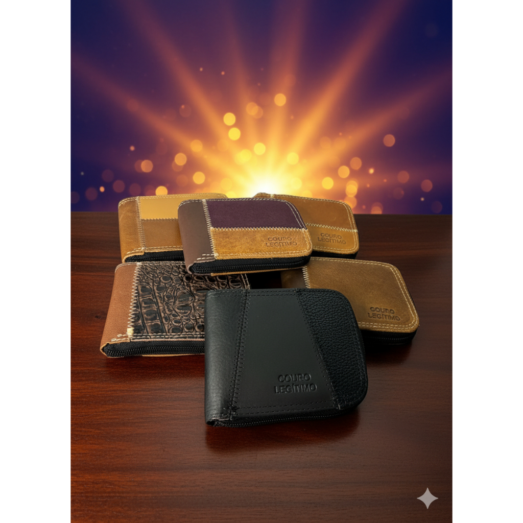 Carteira de Couro Legitimo com Porta Cartões Removível, Espelho e Zíper para Moedas luxo premium