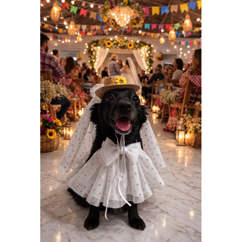 Fantasia Pet Junina Noiva com Chapéu e Bandana Roupa Festa Junina para Cachorro Tamanho Único e PP