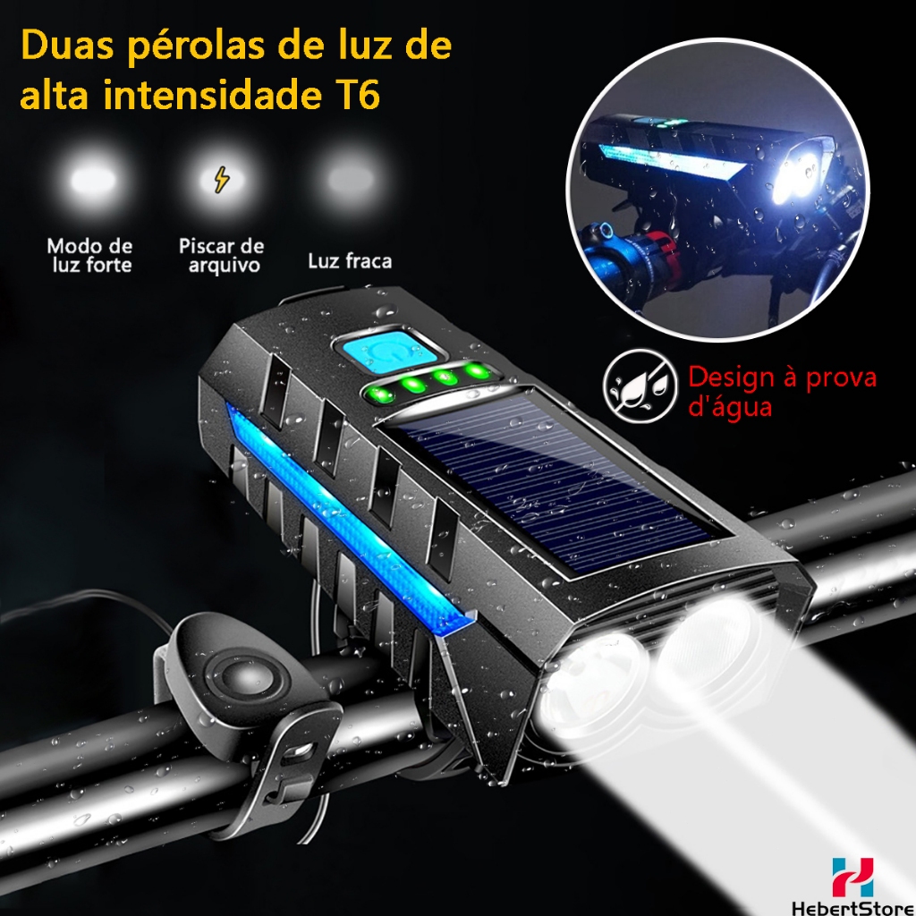 Energia solar Lanterna Bike Com Buzina/Power Bank 3 Em 1 Multifuncional 16H 4000 Lúmens Recarregável À Prova D'Água