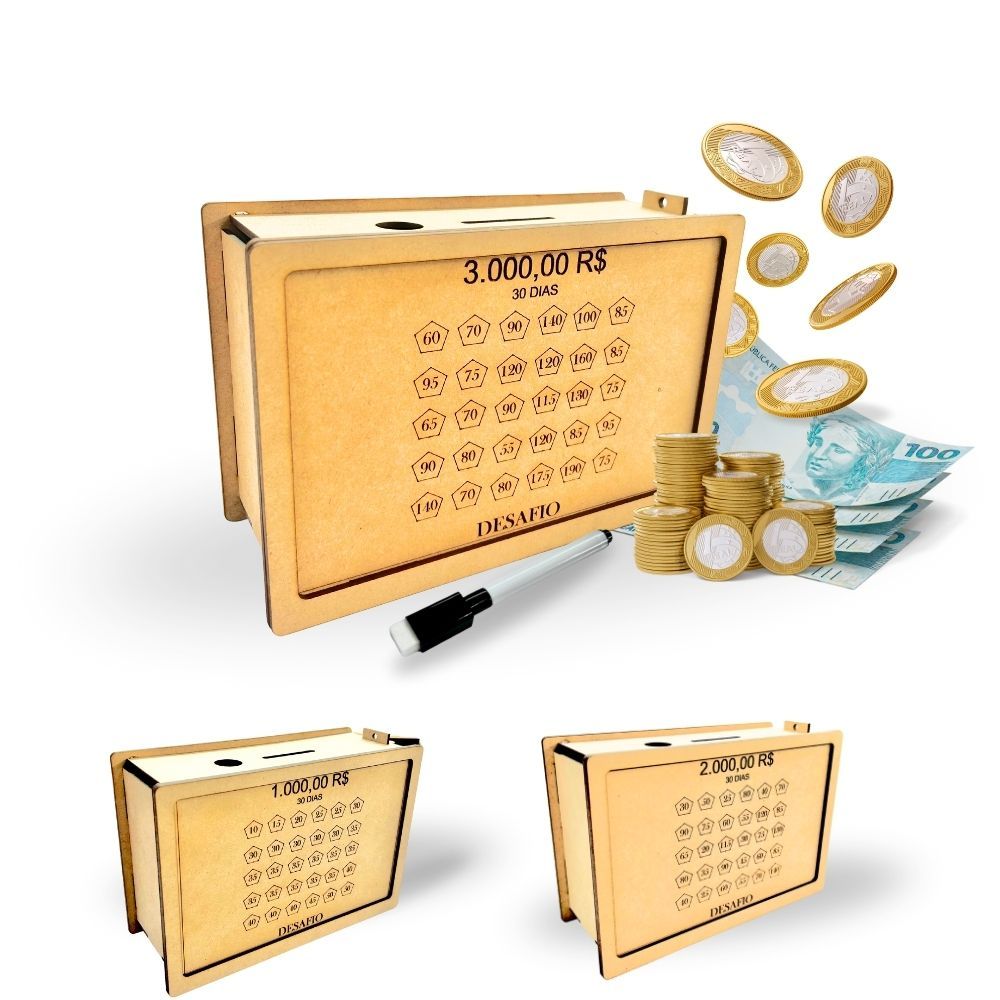 Comprar na ShopeeCaixa Cofre Desafio 1000 2000 ou 3000 + Caneta MDF Método Japonês Dinheiro Moedas Woodbox