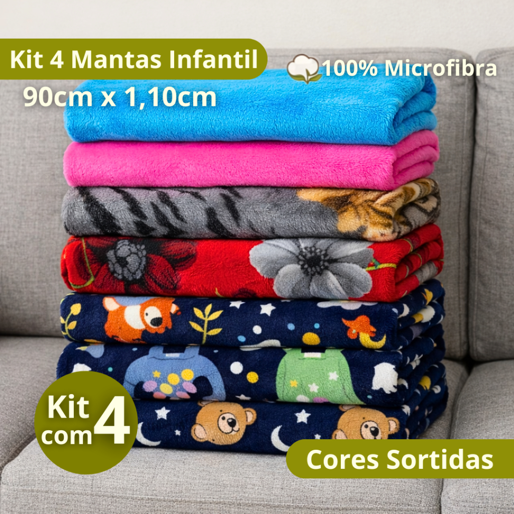 Kit Manta Infantil ou de PET 100% Microfibra Estampas e Cores Variadas 90cm x 1,10m