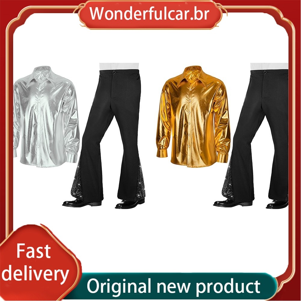 [WDFU] Camisa Masculina Brilhante E Calça Inferior De Sino De Lantejoulas 2 Peças Terno Retrô Hippie Conjunto De Discote