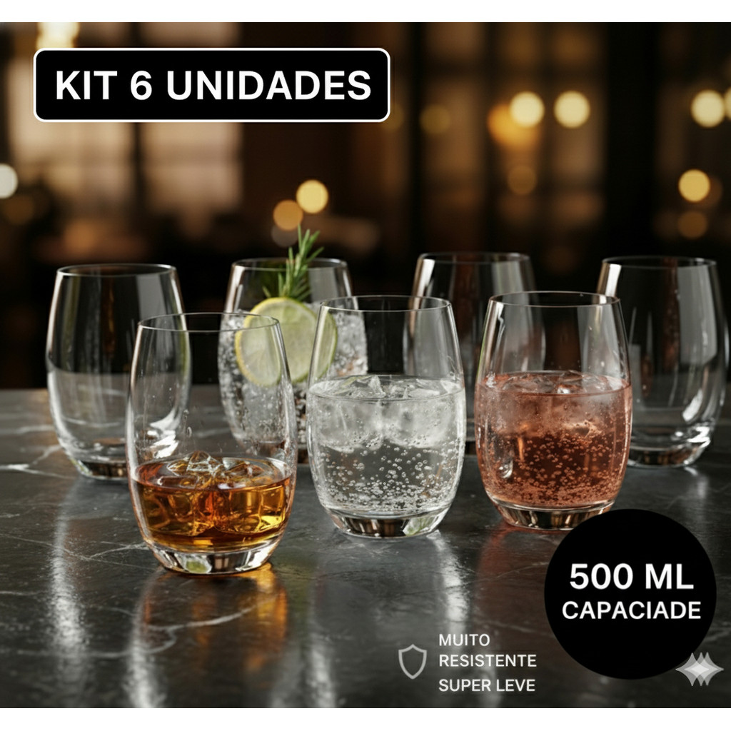 Jogo de Copos Oval Em Vidro Cristalino 6 UND Resistente para Suco Água Refrigerante Chá Café Vinho