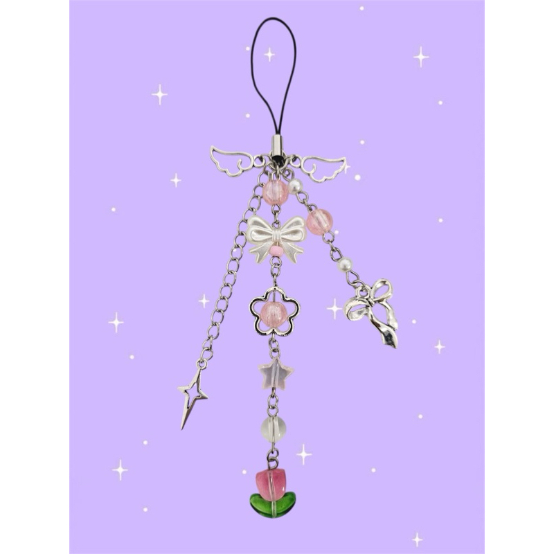 Comprar na ShopeeChaveiro de Tulipa - Chaveiro de celular flor de tulipa rosa e laço de perolas pingente de estrelas