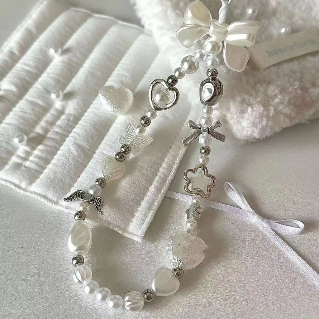 INS Coreano Bonito Arco Branco Coração Pérola Contas Frisado Corrente De Telefone Para Câmera Do iPhone Pendurado Corda