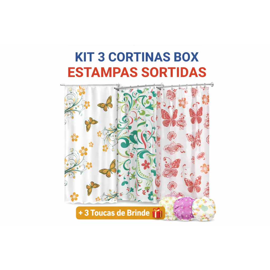 Kit 3 Cortinas Box Banheiro Estampadas Diversas Pague 2 Leve 3 Viés PE Uso Direto Suporte 1,38x1,80m