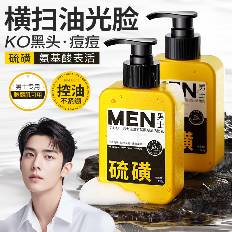 Limpador facial de enxofre, limpador facial de aminoácidos masculino, Remove ácaros, controle de óleo, Anti-acne, acne