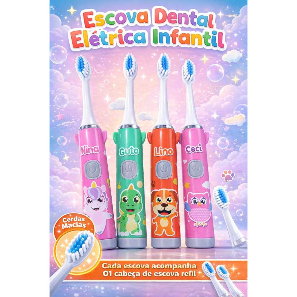 Escova Dental Infantil Elétrica + Refil – Cerdas Macias, Temporizador 2 min + Brinde