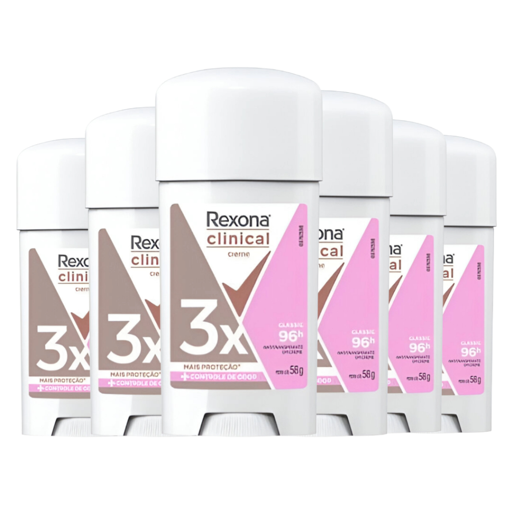 Kit 06 Desodorante Rexona Antitranspirante Creme Clinical Classic Feminino 96h 3x mais Proteção 58g