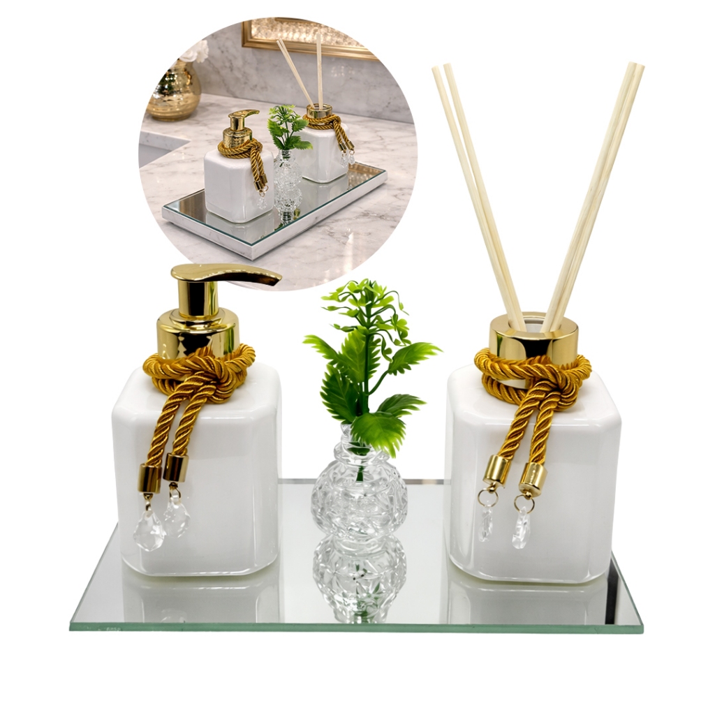 Comprar na ShopeeKit Banheiro Lavabo Completo Aromatizador de Ambiente e Sabonete Líquido (300 ml) Com Bandeja Luxo