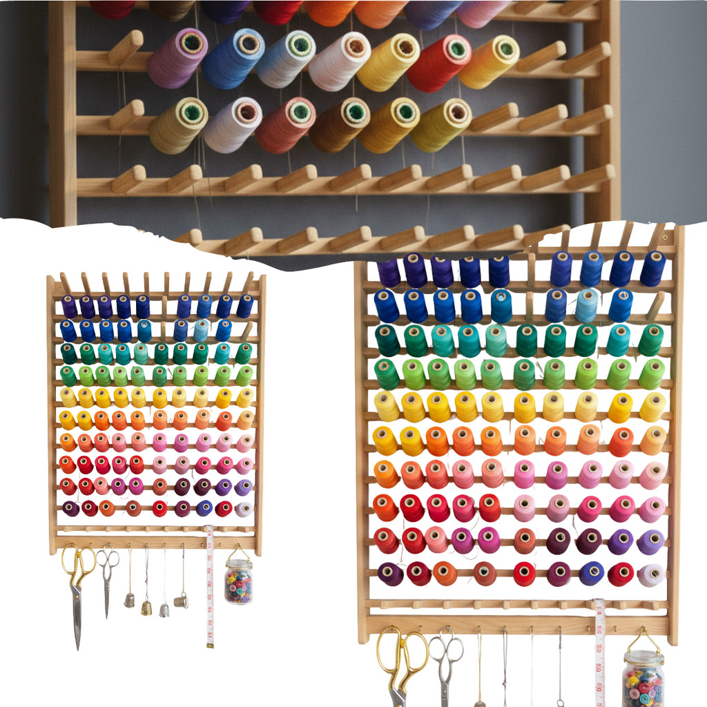 Organizador de Costura em Madeira 100 Cones Porta Linhas Profissional com Suporte para Tesoura e Acessórios