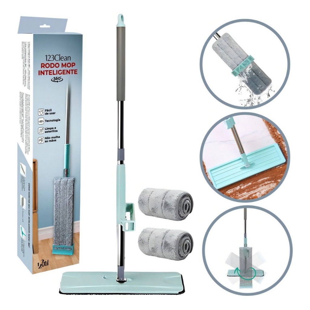 Mop Inteligente Rodo 360° 120cm 123 Clean com Cabo Longo e Refis Lavável