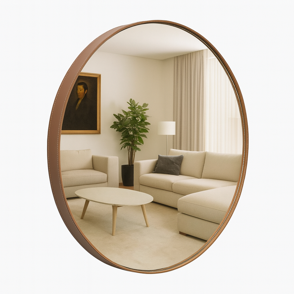 Espelho Adnet Redondo Grande Couro Costurado 60 cm Suporte Fixação Sala Quarto Banheiro Hall