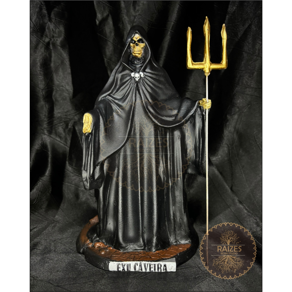 Comprar na ShopeeEstátua/Escultura Exu Caveira Capa Preta com Capuz e Trident em Resina