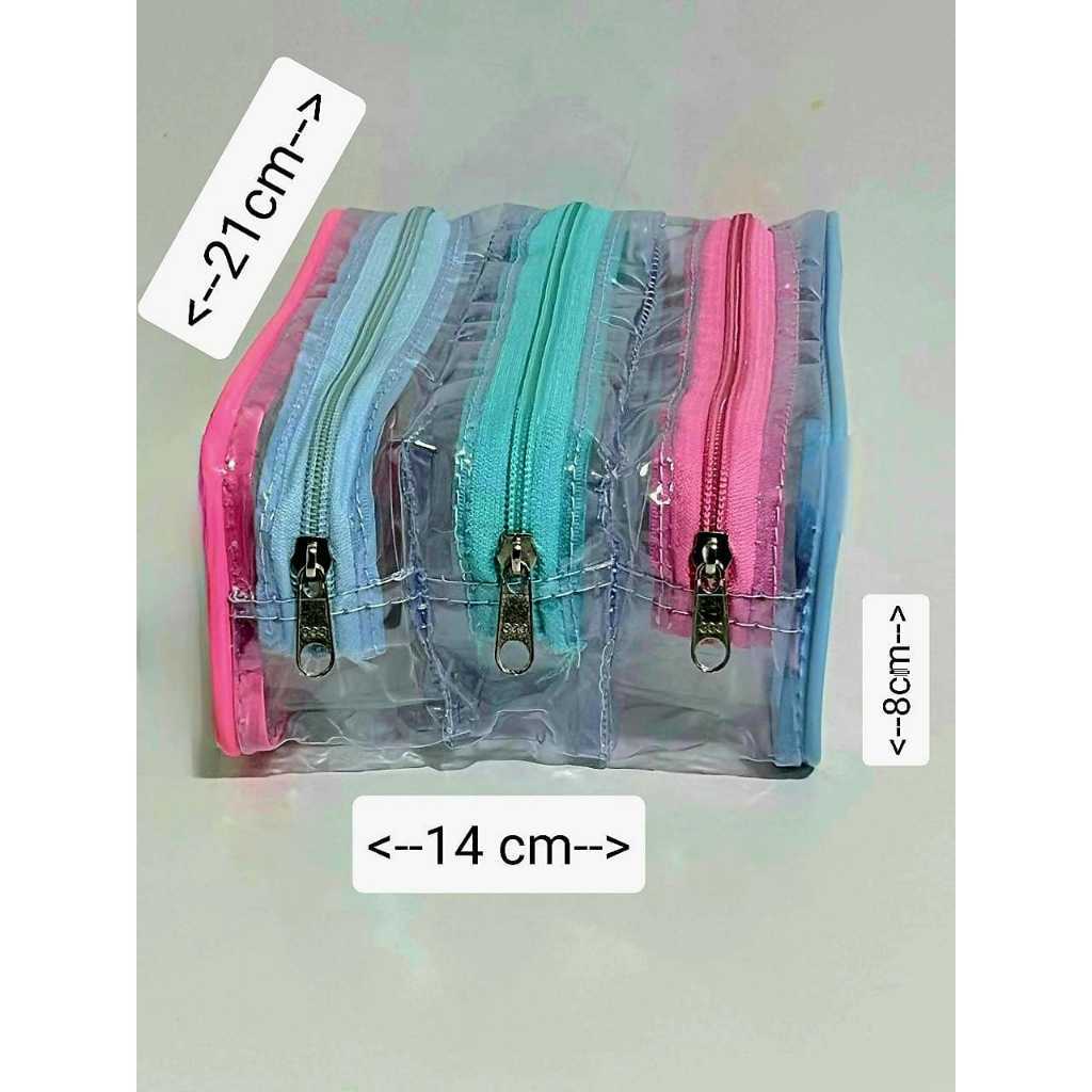Comprar na ShopeeESTOJO TRANSPARENTE COM FRISOS E ZIPER COLORIDOS CONTENDO 3 REPARTIÇÕES