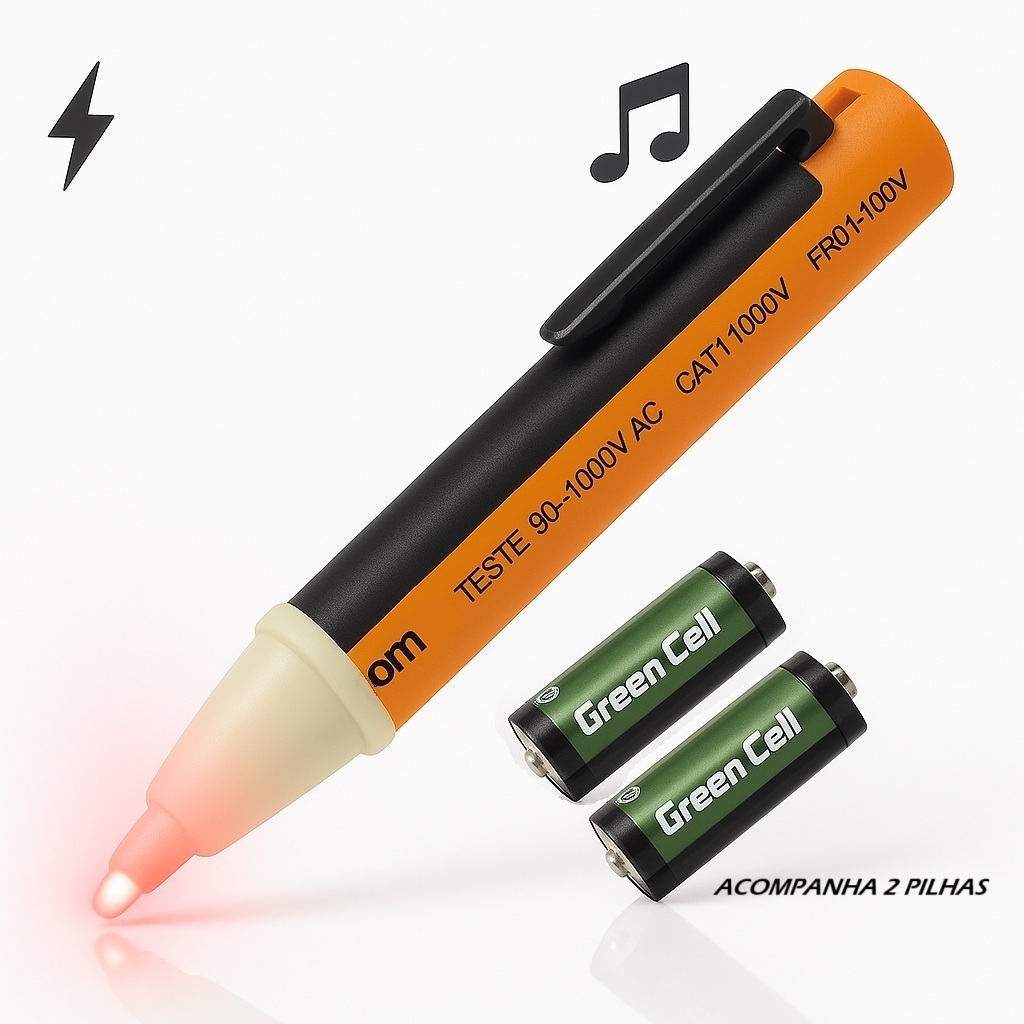 Comprar na ShopeeCaneta Detectora de Tensão AC com Alerta Sonoro com pilha FEPRO-DT90 Detecta Fase este Bip