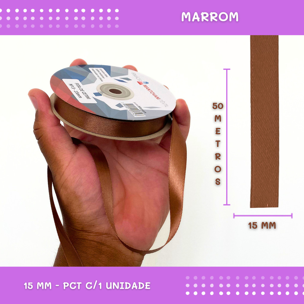 Comprar na ShopeeFita de Cetim Lisa - 15mm - Rolo C/50 Mts COR:MARROM