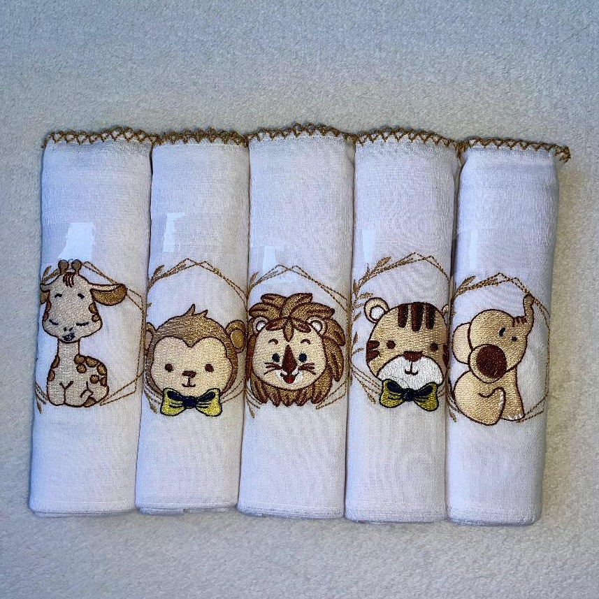 Comprar na ShopeeKit 5 Fraldas de Pano Bordada Safari para Bebê Tecido Duplo 100% Algodão 70x70cm