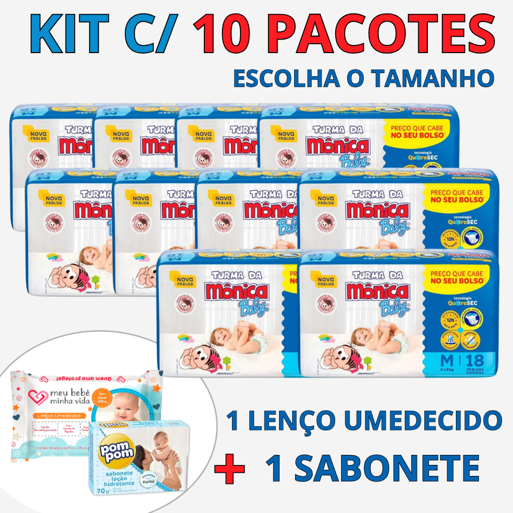 Comprar na ShopeeKit 10 Pacotes de Fralda Turma da Mônica + Lenço Umedecido + Sabonete Infantil