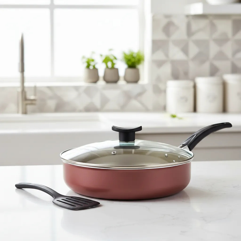 Comprar na ShopeeFrigideira Alta 22cm Funda Antiaderente Com Tampa de Vidro Teflon Cor Cereja Gold + Espátula Nylon