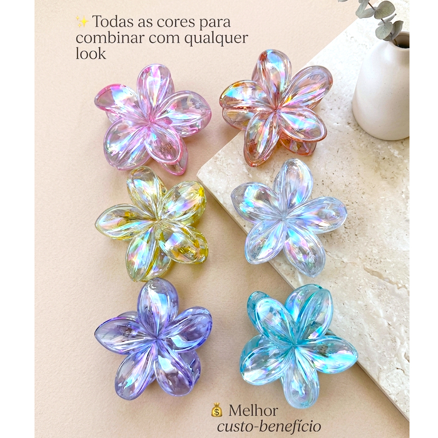 Comprar na ShopeePiranha de Cabelo Flor Holográfica Grande | Presilha Clean Girl Brilho Perolado | Kit 2 3 6 Unidades Cores Sortidas